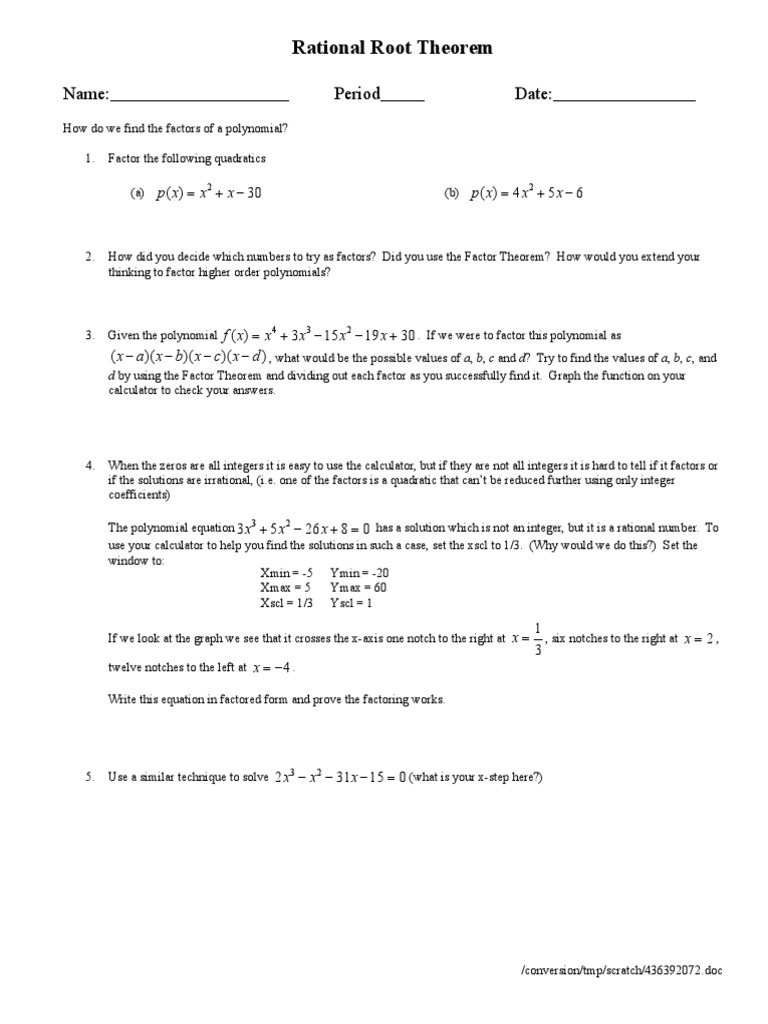 Algebra 2 from prhs.pasoschools.org Looking for the factors of f(x), we could use the remainder theorem to test for the factors of f(x). By using this website, you agree to our cookie policy. Students match functions to their rational roots and students will know right away if they've done it correctly because of the puzzle! Without using a graphing calculator, find the roots to the following equation. State the possible rational zeros for each function. The remainder theorem irrational and imaginary root theorems descartes' rule of signs more on factors, zeros, and dividing the rational root theorem polynomial equations basic shape of graphs of polynomials graphing polynomial functions the binomial theorem The file contains the student worksheet and teache It tells you that given a polynomial function with integer or whole number coefficients, a list of possible.